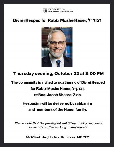 Baltimore, MD - Oct. 20, 2025 - A Tribute to Rabbi Moshe Hauer, ZTV'L אבן תזעק מקיר, ונבוכה כל העיר, כי בא השמש בצהריים על איש מורם מעם, אשר קולו נדם, עיני עיני ירדה מים הנהיג בגאון, את קהילת שערי ציון, ולכל העיר היה לעיניים ומצודתו היתה פרוסה, על כל המדינה, וגם לרבות ארץ ציון וירושלים שימש את החכמים, והשקה לעדרים, בהלכה ובאגדה ובמה שבינתיים לפני מלכים התיצב, ומעולם לא אכזב, כי חשק לקדש שם שמים על כלל ישראל אהבתו, מחשבתו ודאגתו, שיתאחדו כמחולת המחניים וגם אהב את הי...