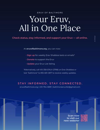 Baltimore, MD - Dec. 30, 2025 - The Eruv of Baltimore has launched a centralized online hub at eruvofbaltimore.org. Community members can now check the Eruv status, support the organization through donations, and manage their listings in one place. To ensure you stay informed, the site also offers sign-ups for weekly Erev Shabbos alerts via email, text, or phone.