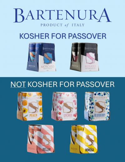 Baltimore, MD - Mar. 8, 2026 - This is a reminder that only the original Bartenura Moscato and Rosato cans are Kosher for Passover. The flavored Moscato and wine cocktail cans, as well as the Froscato Frozen Popsicles, are not Kosher for Passover.