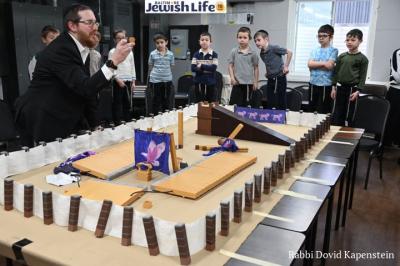 Baltimore, MD - Mar. 11, 2026 - Rabbi Hallel Newman brought his replica of the mishkan to Yeshivas Toras Simcha today. The structure took a year to construct, and Rabbi Newman has visited several schools to display the model and discuss the various functionalities.