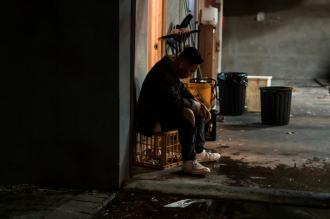 Beside her, another woman held a bottle and a blanket, her daughter lying on the mat in front of her. The two women glanced at e...