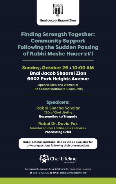 This Sunday, Oct. 26 @ 10AM - Finding Strength Together: Community Support Following the Sudden Passing of Rabbi Moshe Hauer, ZTV'L