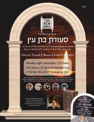 Baltimore, MD – Dec. 1, 2025 – (BJL) Rebbe Avraham Dov of Avritch–Tzfas, the mechabeir of the Bas Ayin, was niftar on 12 Kislev, 5601 (November 24, 1840). His yahrzeit, observed tonight — 12 Kislev — is being commemorated with a yahrzeit seudah and kumzitz at The New Shul (Basement, 6209 Greenspring Ave), with the participation of Rabbi Shimon Barkin (The New Shul), Rabbi Menachem Goldberger (Tiferes Yisroel), Rabbi Amrom Jungreis (Khal Chasidim), Rabbi Nesanel Kostelitz (Machzikei/Aish Kodesh), Rabbi Y. Zvi Weiss (Bais Haknesses Ohr Hachaim), and others participating in this meaningful event.