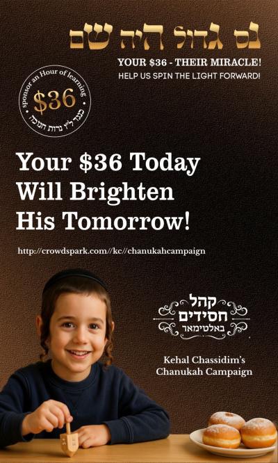 Just as we light 36 candles over Chanukah, each $36 gift adds another spark of light—helping sustain a Chassidish mosad that educates our children, supports local families, and brings warmth and kedusha to Baltimore.