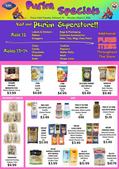 Seven Mile Market Purim Specials in Effect Tuesday, Feb. 24 - Monday, Mar. 2, 2026 / Open This Motzaei Shabbos