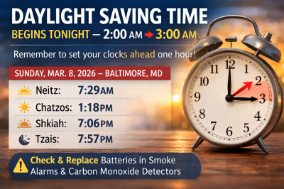 Baltimore, MD – Mar. 6, 2026 – Remember to set your clocks ahead one hour as Daylight Saving Time begins Sunday at 2:00 a.m.